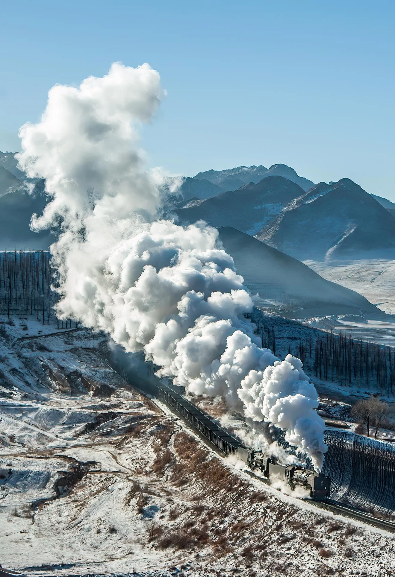 In November 2004 I joined three other photographers to see the Jitong Railway located in Inner Mongolia. The new line was opened in 1995 and ran double-headed QJ class 2-10-2 steam locmotives on all freight trains until 2000. Diesels gradually took over until Autumn 2005 when the line was fully dieselized. It was the world’s last steam-operated mainline. Our group focused on JinPeng Pass, where the terrain demanded much of the railway. Numerous tunnels and spectacular viaducts add to the drama of the line. Signaling was provided by electrically interlocked semaphore signals. These were replaced by modern color light signals after 2005.